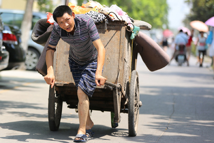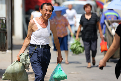 圖一:買菜歸來的市民,高溫下緊鎖眉頭。 圖二:高溫下的勞動者。 圖三:出行的市民全副武裝抗曬。 圖四:送貨的師傅大汗淋漓。