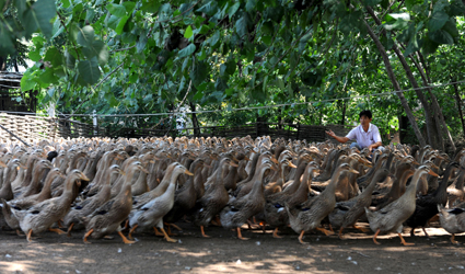 8月23日,鳳臺(tái)縣桂集鎮(zhèn)園藝村農(nóng)民靳華碑給蛋鴨喂食;春影哆呴L(zhǎng)大的靳華碑一直有個(gè)創(chuàng)業(yè)致富夢(mèng)想。2007年,飼養(yǎng)蛋鴨使他收獲創(chuàng)業(yè)第一桶金。2009年,村民們紛紛效仿他開始養(yǎng)鴨子,靳華碑沒有排斥村里人養(yǎng)鴨,而是免費(fèi)提供養(yǎng)鴨技術(shù)服務(wù)。經(jīng)過幾年發(fā)展,靳華碑成立了以自己名字命名的安徽鳳臺(tái)縣靳華碑蛋鴨養(yǎng)殖專業(yè)合作社,對(duì)合作社成員實(shí)行“統(tǒng)一供飼料、統(tǒng)一供鴨種、統(tǒng)一供藥品、統(tǒng)一技術(shù)服務(wù)、統(tǒng)一回收”服務(wù)模式。合作社成員現(xiàn)已達(dá)到130戶,年存欄蛋鴨30多萬只,創(chuàng)產(chǎn)值2800萬元,帶動(dòng)了300多人就業(yè)。