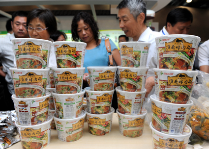 9月7日至9日,主題為“綠色、開放、創(chuàng)新、崛起”的2012中國安徽(合肥)農(nóng)業(yè)產(chǎn)業(yè)化交易會在安徽國際會展中心舉行。我市各縣區(qū)農(nóng)業(yè)部門精心組織,積極參展,淮南牛肉湯、黃晶梨、酥瓜等一大批特色農(nóng)產(chǎn)品受到省內(nèi)外客商關(guān)注。圖一:獨(dú)具楚風(fēng)漢韻特色的淮南展館人潮熙攘。圖二:白藍(lán)集團(tuán)推出的淮南牛肉湯方便攜帶,吸引在外工作、學(xué)習(xí)的淮南老鄉(xiāng)的搶購。