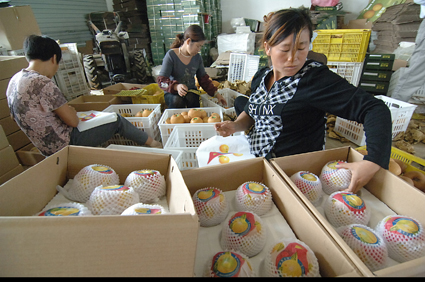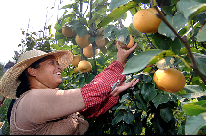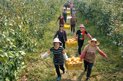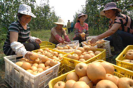 9月19日上午,淮南市謝家集區(qū)孫廟鄉(xiāng)的黃晶梨園里一派熱鬧的豐收景象。自2009年該鄉(xiāng)采取土地流轉(zhuǎn)發(fā)展經(jīng)濟(jì)開發(fā)黃晶梨生產(chǎn)基地以來,已形成生產(chǎn)、倉儲(chǔ)、物流、深加工為一體的產(chǎn)銷模式,還可為廣大市民及攝影家提供旅游觀光和藝術(shù)創(chuàng)作的好去處。特別是自去年以來,孫廟鄉(xiāng)在黃晶梨成熟的季節(jié)舉辦“采摘節(jié)”,今年已是第二屆,19日當(dāng)天,就收獲了2萬公斤黃晶梨。圖一:村民喜摘黃晶梨。圖二:滿臉豐收的喜悅。圖三:挑選精品梨。圖四:裝箱外銷。