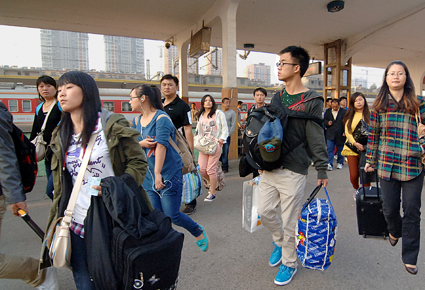 10月7日清晨,淮南火車站、淮南高速公路入口處,迎來(lái)“十一”“中秋”雙節(jié)返程市民,他們滿懷安全、順利、收獲喜悅歸來(lái),將投入到學(xué)習(xí)和工作崗位上。 圖為10月7日從上海開(kāi)來(lái)的K8366次列車,市民在淮南火車站下車時(shí)的場(chǎng)景。