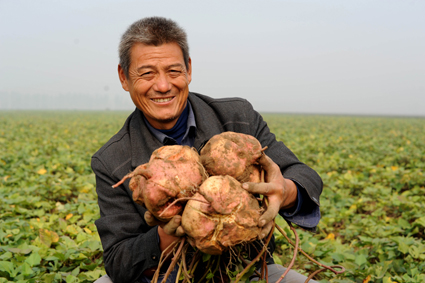 圖二:毛集實(shí)驗(yàn)區(qū)焦崗湖鎮(zhèn)孫臺(tái)村村民孫兆芝開心展示豐收的出口訂單山芋。