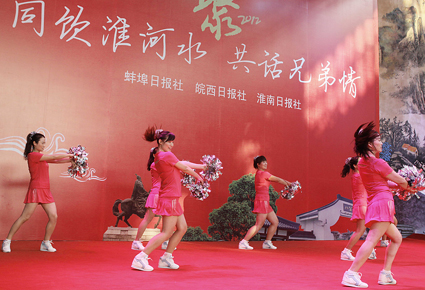 同飲淮河水,共話兄弟情,蚌埠、六安、淮南三家淮河流域城市報社聯(lián)系密切,已在長期的交流合作中結(jié)成了兄弟般的友誼,一年一度的記者節(jié)聯(lián)歡活動更是進(jìn)一步推動了區(qū)域媒體間的發(fā)展與合作。圖為演出現(xiàn)場。