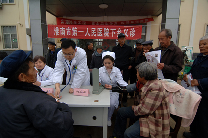 衛(wèi)生部部長(zhǎng)陳竺在解讀《衛(wèi)生事業(yè)發(fā)展“十二五”規(guī)劃》時(shí)強(qiáng)調(diào)指出:“我國(guó)將逐步提高政府對(duì)新農(nóng)合和城鎮(zhèn)居民醫(yī)保的補(bǔ)助標(biāo)準(zhǔn),到2015年達(dá)到每人每年360元以上,個(gè)人繳費(fèi)水平相應(yīng)提高!蓖瑫r(shí),中國(guó)還將逐步提高基本醫(yī)療保險(xiǎn)最高支付限額和費(fèi)用支付比例。普遍開展城鎮(zhèn)居民醫(yī)保、新農(nóng)合門診醫(yī)療費(fèi)用統(tǒng)籌,支付比例提高到50%以上,穩(wěn)步推進(jìn)職工醫(yī)保門診統(tǒng)籌。圖為11月21日上午,市第一人民醫(yī)院組織醫(yī)護(hù)人員在大通區(qū)孔店鄉(xiāng)為村民免費(fèi)送醫(yī)送藥場(chǎng)景。