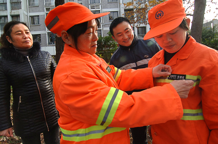 為深入貫徹黨的十八大精神,建設美好淮南,市城管行政執(zhí)法局為全市3088名環(huán)衛(wèi)工人統(tǒng)一制作了工號牌,掛牌上崗。今后環(huán)衛(wèi)工人在上崗作業(yè)時,統(tǒng)一佩戴標有單位、姓名、編號的黑色工號牌,塑造文明規(guī)范的環(huán)衛(wèi)行業(yè)服務形象,接受社會監(jiān)督。圖為12月4日下午,田家庵區(qū)環(huán)衛(wèi)工人身穿佩戴著統(tǒng)一標志的工作服。