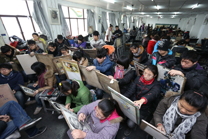 12月13日,某美術(shù)學(xué)校里,數(shù)百位美術(shù)類高考生正在認(rèn)真畫完臨考前的最后一張素描作業(yè)。據(jù)了解,明日淮南美術(shù)類考生將啟程赴蚌埠安徽財(cái)經(jīng)大學(xué)考點(diǎn)參加“決定命運(yùn)”的2013年普通高校招生美術(shù)類專業(yè)統(tǒng)考。