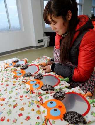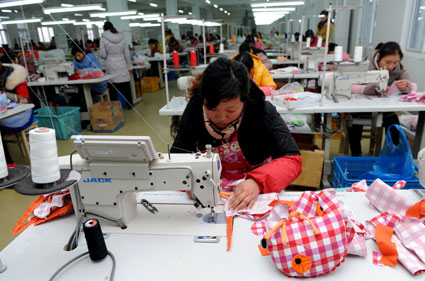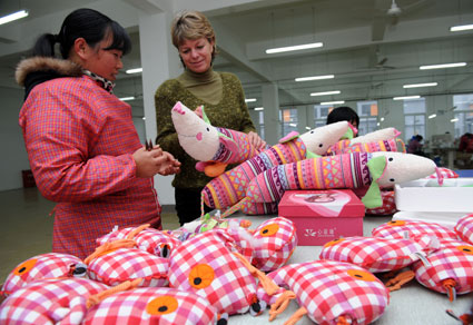 1月16日,在毛集經(jīng)濟(jì)開(kāi)發(fā)區(qū)淮南悠童玩具有限公司生產(chǎn)車間內(nèi),來(lái)自拉脫維亞的玩具技術(shù)專家塔其亞娜·葛里卡指導(dǎo)農(nóng)家女加工出口玩具;茨嫌仆婢哂邢薰咀2011年成立以來(lái),通過(guò)技術(shù)培訓(xùn),使110余名農(nóng)家女農(nóng)閑時(shí)間掌握一技之長(zhǎng),加工的各類玩具娃娃、家居用品出口歐洲,農(nóng)家女人均月收入近2000元,公司年均出口產(chǎn)值300多萬(wàn)美元。