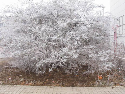 當(dāng)日清晨,記者經(jīng)過淮南洞山中路老龍眼附近,看到路北側(cè)空曠地樹枝上形成“樹掛”,玉樹瓊花,甚為奇特。經(jīng)向市氣象部門求證,確實為“霧凇”,只是在我們這個地區(qū),極為少見,不容易大面積形成,只是在局部小氣候環(huán)境中出現(xiàn)。