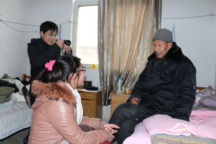 圖為大學(xué)生夏澤洋正在為敬老院的老人拍照片。