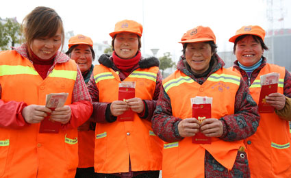 圖為鄉(xiāng)村保潔員們開心地領(lǐng)取年終獎。