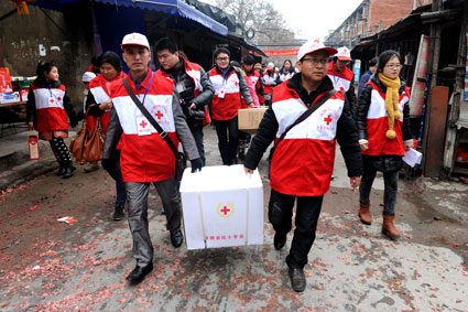 春節(jié)期間,淮南市紅十字會開展“博愛送萬家”主題活動,向260余戶困難群眾發(fā)放救助款物約35萬元。圖為來自社會各界的紅十字會志愿者踴躍捐款獻愛心。