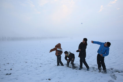 圖一、19日一早,鳳臺(tái)朱馬店農(nóng)田里,孩子們?cè)诤窈竦姆e雪上盡情地玩耍。 圖二、銀裝素裹的鄉(xiāng)村雪景。