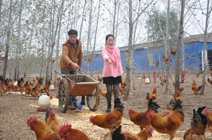 他的決定遭到了不少親友的反對,有的甚至對他冷嘲熱諷,可孫倫洋卻說,現(xiàn)在圖的是眼前的利益,對子孫來說無益,而國家在環(huán)境保護(hù)方面力度逐年加強(qiáng),投資的項目早晚要關(guān)停。晚停不如早停,早做轉(zhuǎn)型的準(zhǔn)備。投資的錢打了水漂,購買的機(jī)械設(shè)備閑置在家,該如何轉(zhuǎn)型呢?孫倫洋轉(zhuǎn)而一想,自己不是還有80畝荒地嗎,不如發(fā)展特色農(nóng)業(yè)。他首先在荒地里開辟了兩畝油菜,搭起了葡萄架,但總不見生長,于是請教農(nóng)技專家,發(fā)現(xiàn)荒地的土主要成分是細(xì)灰,沒有“營養(yǎng)”。于是,孫倫洋又開始搗鼓起土雞養(yǎng)殖,利用土雞糞便化成土壤的養(yǎng)料。他引進(jìn)了當(dāng)?shù)氐穆辄S雞和“淮南王”兩個品種3000余只,在荒地上進(jìn)行散養(yǎng)!皠e人用的都是飼料,出欄快,但肉質(zhì)不好吃,我就不這樣做!睂O倫洋就地取材,在當(dāng)?shù)厥召徲衩仔←溩鳛轱暳,平時有空他就趕雞上樹,讓土雞充分地活動起來。別人養(yǎng)的雞半年出欄,而孫倫洋養(yǎng)的雞卻至少要等到一年半以上才能出欄,每只雞平均4斤多重,肉質(zhì)鮮美,在市場上供不應(yīng)求。