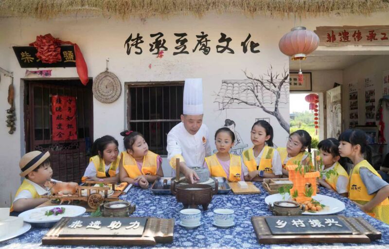 8月22日,在壽縣雙橋鎮(zhèn)大郢村,壽州豆腐宴非遺代表性傳承人張士宏給來(lái)研學(xué)的小朋友講解豆腐宴傳統(tǒng)制作技藝。