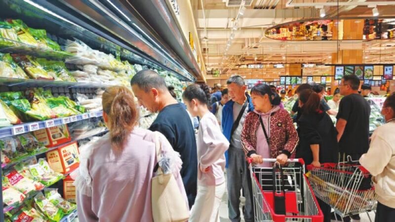 在市區(qū)一家大型購物中心,不少市民手提購物袋,滿載而歸。生鮮果蔬、特色食品、國潮文創(chuàng)等商品銷售紅火。餐飲街區(qū)同樣人氣十足,多家熱門餐廳出現(xiàn)排隊等位現(xiàn)象。