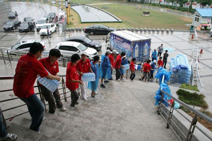 圖一:志愿者們正加緊運(yùn)送瓶裝水