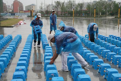 圖二:志愿者們冒雨將小板凳擺放整齊