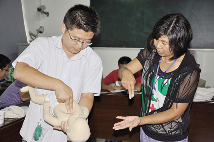為了增強(qiáng)供電公司安檢和野外作業(yè)人員的應(yīng)急救護(hù)能力,8月10日,市紅十字會組織多位志愿者為他們開展觸電、溺水、野外作業(yè)意外傷害等應(yīng)急救護(hù)技能強(qiáng)化培訓(xùn)。圖為培訓(xùn)老師在指導(dǎo)應(yīng)急救護(hù)操作。(記者 陳崇韌 攝)