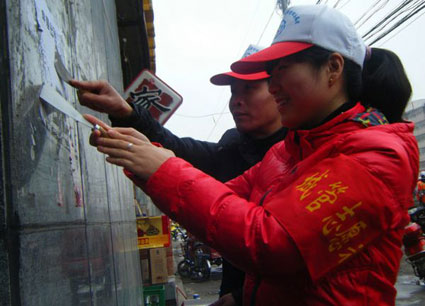 圖:城管志愿者正在清除路邊墻壁上的“牛皮癬”。