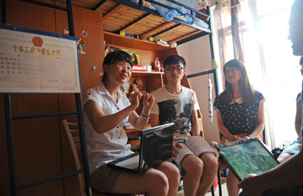 圖二:何延延(左)與創(chuàng)業(yè)團隊研究歐斯特青年翻譯服務(wù)部以后創(chuàng)業(yè)發(fā)展方向。