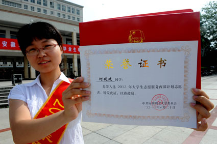 6月26日,安徽理工大學(xué)外國語學(xué)院英語專業(yè)2013屆畢業(yè)生何延延開心展示大學(xué)生志愿服務(wù)西部計劃志愿者榮譽證書,奔赴池州市東至縣偏遠(yuǎn)鄉(xiāng)村開展為期一年的基層青年工作。