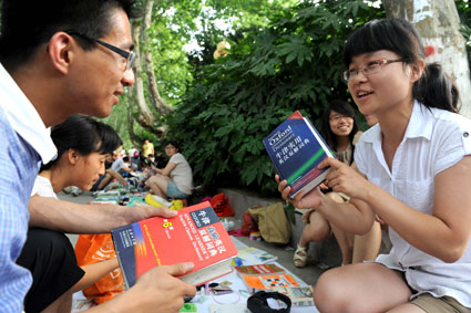 圖三:何延延(右)在校園跳蚤市場中將用過的學(xué)習(xí)用品、工具書低價處理給低年級學(xué)生。