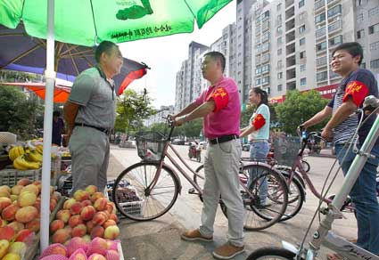 圖一為“文明創(chuàng)建志愿者騎行團”在居仁村內(nèi)巡查。圖二為志愿者們向水果攤主宣傳文明創(chuàng)建要求。